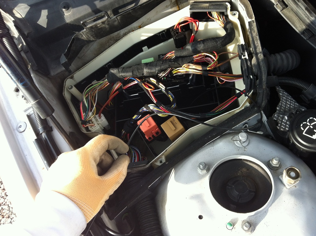 Nu bör du se botten på en vit plastbalja som är en säkringsbox som sitter under kupéfiltret på passagerarsidan i motorutrymmet
