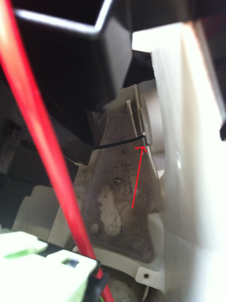 Som ni kan se på bild 6 har jag redan borrat ett hål där och dragit igenom kabeln. Jag borrade med ett 4mm borr, var noga med att kolla i säkringsboxen först så ni inte har några kablar eller kontakter liggandes i botten på den vita plast baljan!