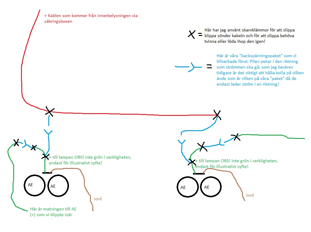 Nu har vi alltså 2st +matningar till AE, den ena från original spänningskälla och den andra från innerbelysningen!