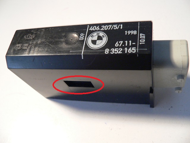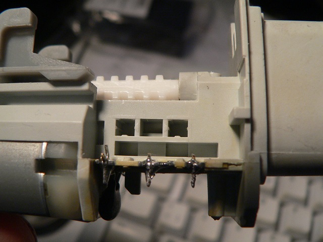 | Utan en riktig tennsug är det svårt att löda loss tre ben samtidigt, så jag klippte loss den befintliga brytaren och lödde därefter loss de kvarsittande stumparna en och en. Det visade sig då att de sitter i skåror, inte hål (bild 10), som jag trott. Detta underlättar både loss- och den senare fastlödningen och det var alltså inte nödvändigt att klippa i det första läget. Men det kanske ändå förenklade. Brytarhuset har två styrtappar, som positionerar kontakten exakt. Dessutom är kontakten limmad, dock inte värre fast än att det går att bända loss den rakt utåt (bilder 8 och 10 igen). |