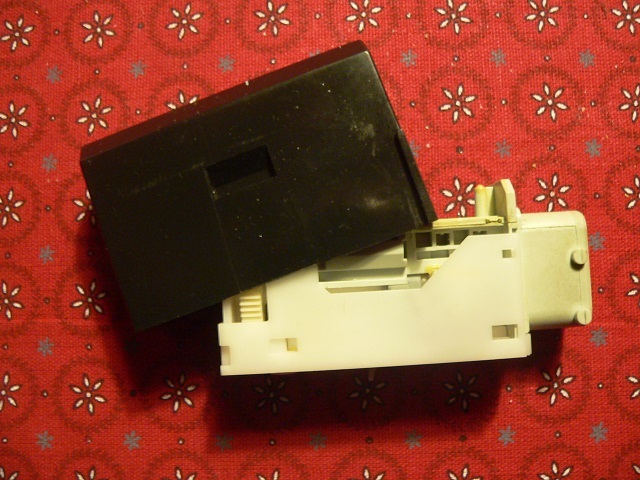 | Nu går det att bända av LMs svarta hölje. De nämnda inbuktningarna i höljet låser även på insidan, men de utgör ingen speciell svårighet. Den återstående enheten delas sedan genom att med en kniv eller fin skruvmejsel bända upp fyra små låsningar, två på varje sida (bild 5) och dra isär de båda ”halvorna”. |