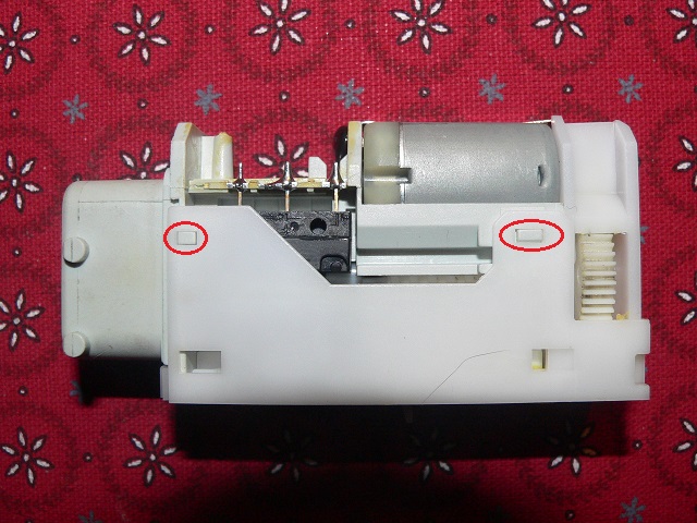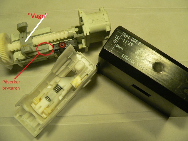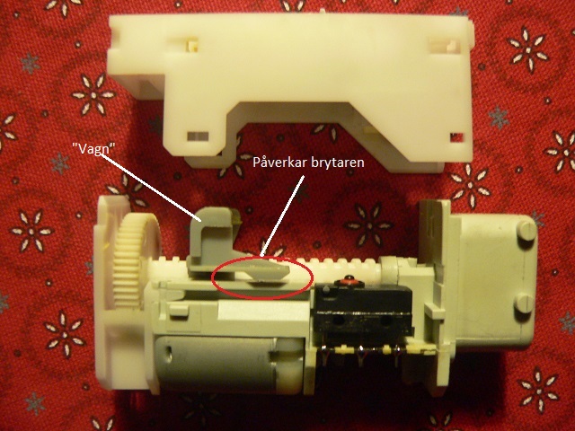 LM har i huvudsak två slitagedelar: själva elmotorn samt den mikroströmbrytare som är med och styr. Resterande rörliga plastdelar slits säkert också en del och kan med tiden nog göra så att toleranserna ökar, med följd, till exempel, att brytarens manöverknapp inte blir tillräckligt distinkt nedtryckt. Steg 1, isärtagning LM sitter fasttryckt ovanpå låset. Ett antal plåttappar håller LM på plats. Den säkras också i läge av en hake på själva låshuset som griper in i motsvarande inbuktningar i sidan på LMs svarta hölje (bild 2). Hakens grepp är inte absolut, utan med ett visst mått av våld/kraft kan LM bändas av från låset. |