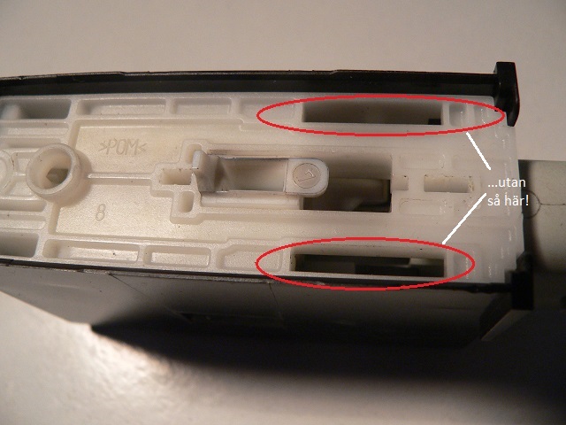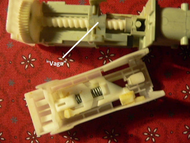 | Lägg märke till den lilla rörliga plastdetaljen som löper fritt i ett spår i LMs undersida (bild 3). Det är den som påverkar upp-/låsningen. Jag återkommer till den senare. |