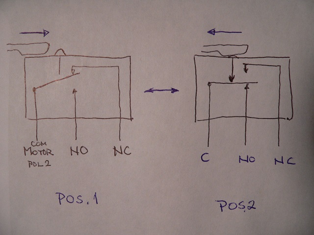 | Nu ser det ut så här (bilder 6A-6C). Vi koncentrerar oss härnäst på den del som huserar motor och mikrobrytare. Den senare är av växlande typ och fungerar enligt denna skiss (bild 7). Se också min kommentar i slutet av artikeln.) |