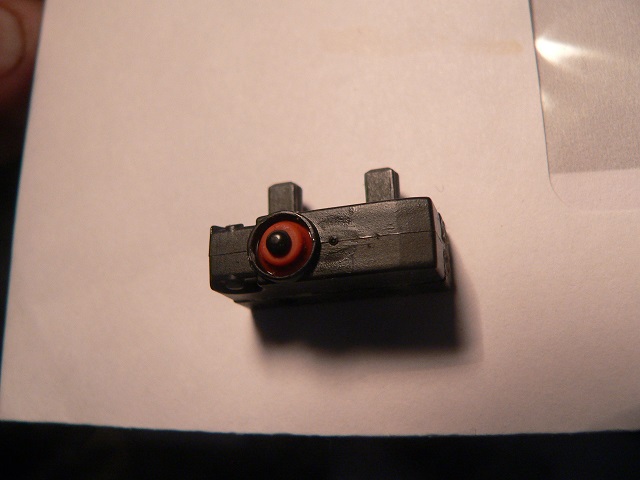 | Nu var det dags för den nya brytaren. Till att börja med rätade jag ut benen på den, men lät dem peka lite snett utåt, så att de inte blev i vägen och spände emot när jag sedan limmade fast brytaren med epoxylim (bild 11). Positioneringstapparna, även om för små, räknar jag med ändå kommer att hjälpa till att hålla kvar brytaren bättre under den eventuella långa tjänstgöring, som kan bli aktuell i framtiden. |
