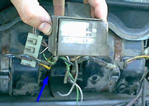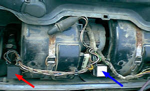 Kontrollerade efter tips på 7-series-digest en tempgivare som sitter under fläktmotorn. Den skall om jag förstått rätt hindra AC från att gå om evaporatorn är nedisad. Den visade sig vara OK, men när jag testade med ett nytt kompressorrelä, så började ACC:n fungera!Täckpanelen ovanför fläktmotor och torkarmekanik. ![]() Sju skruvar från sidorna, se de svarta pilarna. Fyra skruvar ovanifrån, se den röda pilarna. Lossa inte skruvarna som håller luftspjällen, dessa följer snällt med upp. ![]() Tempgivaren på plats. Röda pilen pekar på givaren, blåa pilarna på skruvarna som håller den (och fläktmotorn). 8 mm skalle. Givaren har till uppgift att hindra AC:n från att gå om evaporatorn är nedisad. ![]() Tempgivaren losstagen. Givaren sitter väldigt trångt, enklast är att lossa allt kablage och alla reläer runt fläktmotorn och vika dessa bakåt. Observera känselsprötet som är c:a 20 cm långt. Det dras ur ett hål under fläktmotorn. Hålet syns inte på bilden, men blå pil indikerar riktningen. Den kan vara svår att få tillbaks, lirkande måste gå före våld i detta fall. ![]() Själva givaren, med fästanordning till vänster och kontakter på huset (blå pilar). ![]() Det felaktiga kompressorreläet (blå pil) och det tidigare utbytta reläet som ger fullfart på fläkten (röd pil). Om fläkten går, men inte på fullfart (fläktreglaget i max) är detta relä felaktigt. |
