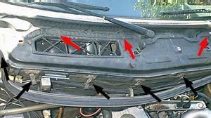 Panelen sitter med sex skruvar. Fyra små stjärnskruvar i ovankant och två skruvar med tio mm skalle i uttaget där bilstereon sitter. Se de röda pilarna på bilden. Man måste alltså ta bort bilstereon och hållaren den sitter i. När man tagit bort dessa skruvar sticker man in handen i hålet för stereon och känner efter ett gummirör, tjock som en tumme ungefär. Den sitter i bilstereouttaget, se den blåa pilen, fast längst in i bilstereouttaget. Den lossas från bilen, skall sitta kvar på panelen. ![]() Angående driften av klimatorn.