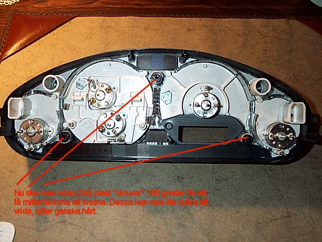 Nu ska man vrida tre st "plastskruvar" 180 grader för att få mätartavlorna att lossna. Dessa kan vara lite svåra att vrida, sitter ganska hårt. |