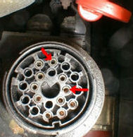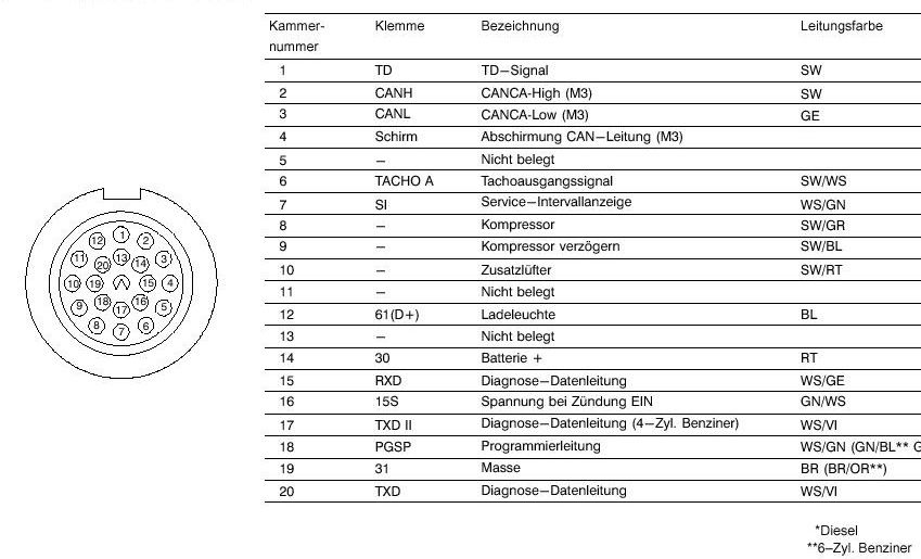 Samma metod, fast pol 7 och 19 istället.Var extremt noga med att ta rätt stift. Det är lätt att se fel och ta stift 18 istället för 19. Det är inte så hälsosamt för bilen att ta fel stift. Använd gärna ett 470 Ohm:s motstånd i serie innan man kortsluter polerna. Om man då råkar ta fel poler så undviker man en riktig kortslutning. Slå på tändningen. Stäng av alla strömförbrukare. Använd en kabelstump eller liknande och kortslut 7 och 19 i diagnosuttaget, 3 sekunder för att återställa oljeservice och 12 sekunder om det är inspektion som behöver nollas. Om onormala indikeringar finns eller om nollställningen inte fungerar kan det bero på att batteriet eller kondensatorerna som sitter inuti instrumentpanelen är slut. Stiftschema för 20-poligt diagnosuttag --> |