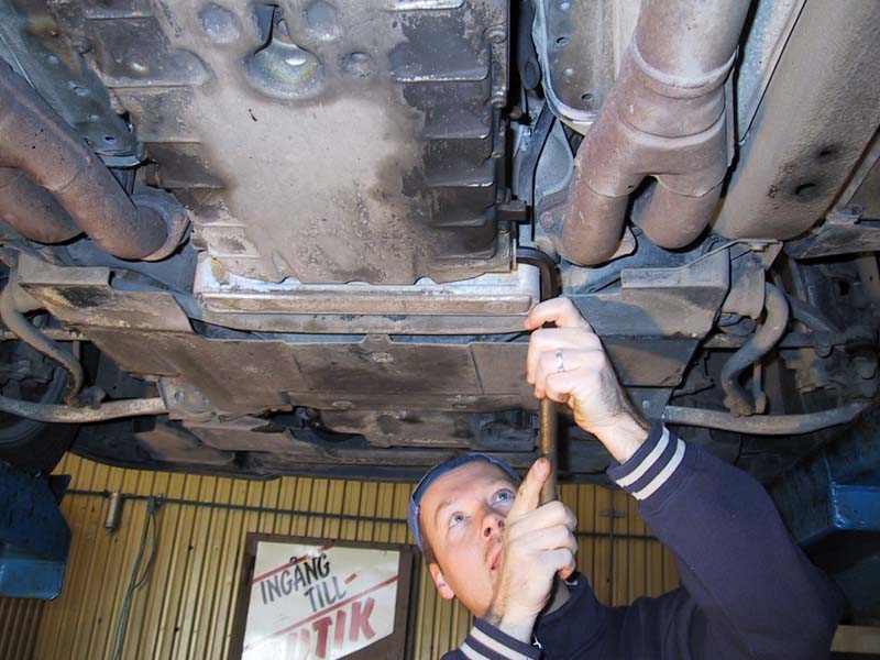 | Montera ett nytt filter och lyft upp tråget. Kolla så att packningen inte hamnar fel när tråget skruvas fast. Skruva i alla bultar och dra åt dem när allt sitter rakt och snyggt. Skruva sedan tillbaka avtappningspluggen, om detta inte redan är gjort. Glöm inte att byta metallpackningen.