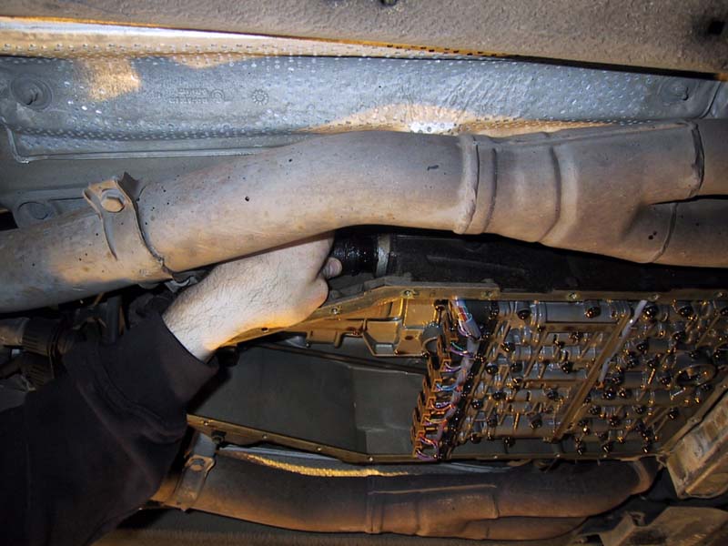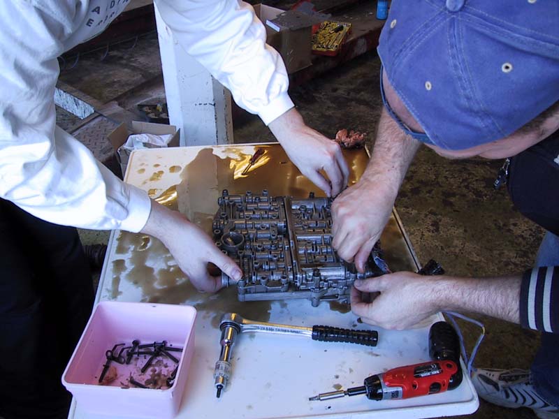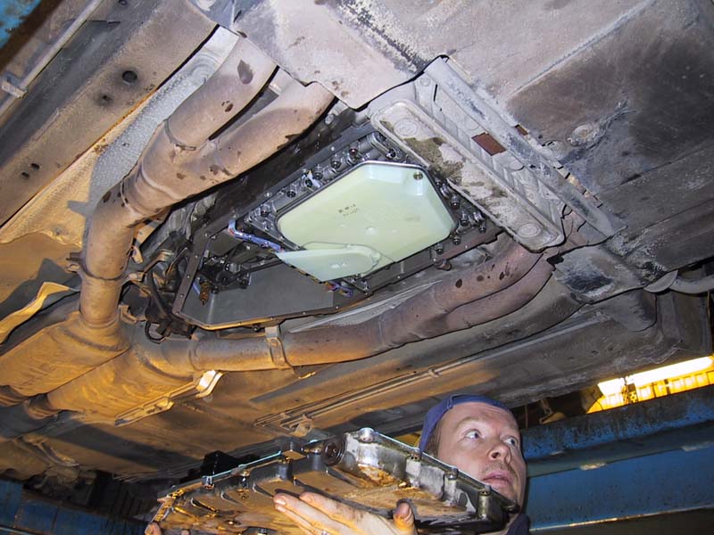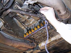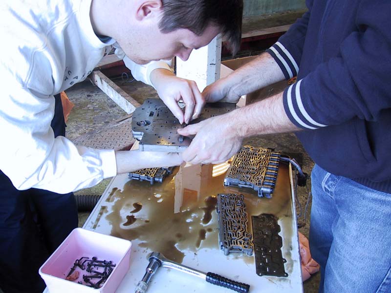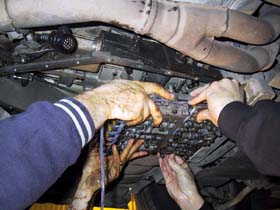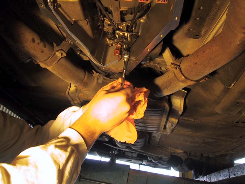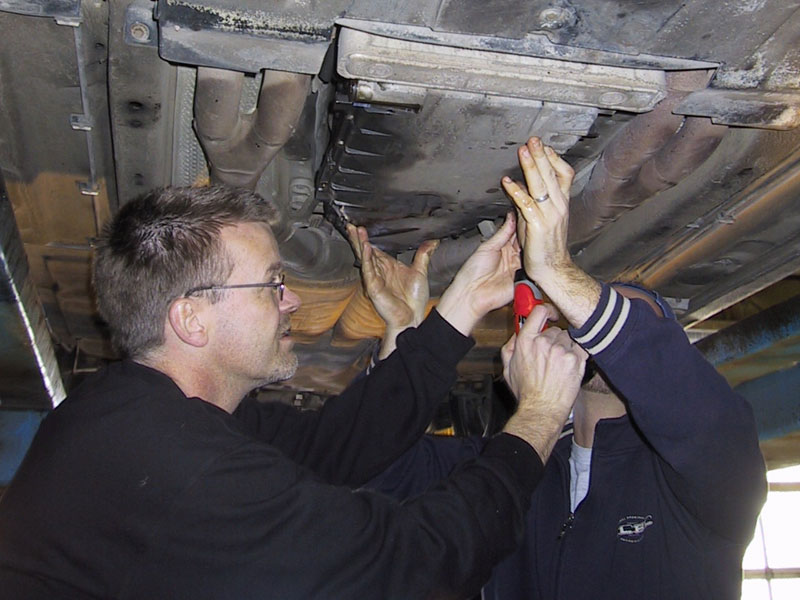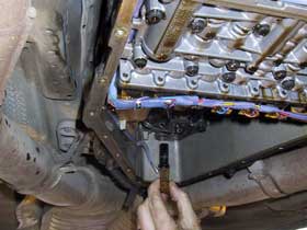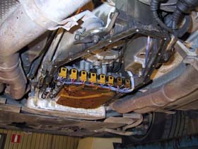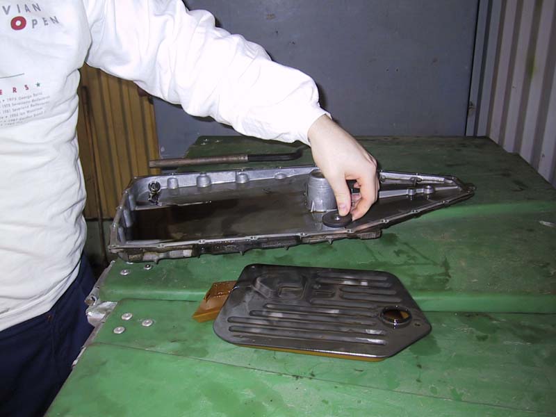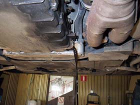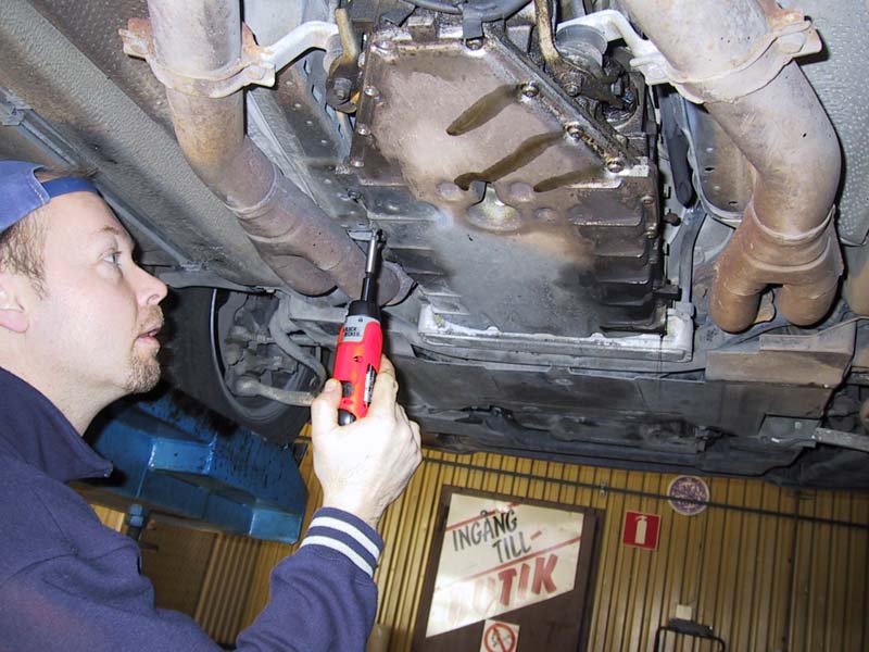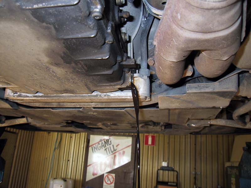 | Det sista som skall göras är att återfylla med olja. Principen är följande. Börja med att lossa påfyllningspluggen som sitter i tråget (17 mm insex), ungefär mitt under lådan. Fyll sedan på med olja tills olja rinner över kanten. Sätt tillbaka påfyllningspluggen, men dra inte åt den. Det är då dags att starta motorn. Låt motorn gå på tomgång och arbeta igenom växlarna en och en. Låt motorn dra lite på varje växel, ett par sekunder eller så. Ställ sedan växelväljaren i N. Låt nu motorn stå på tomgång och fyll i mer olja. Det går i minst lika mycket som fylldes i första gången. När olja rinner över kanten igen, är det dags att återmontera påfyllningspluggen och dra åt den. Det skall nu ha gått åt mellan 9 och 11 liter olja, lite beroende på hur mycket man spiller förstås. *