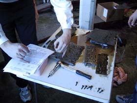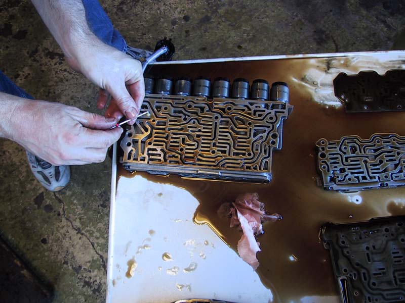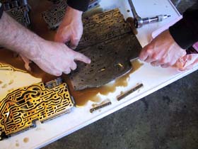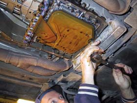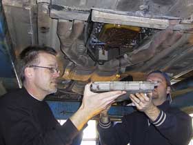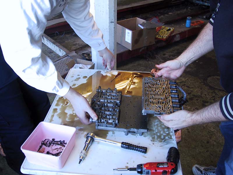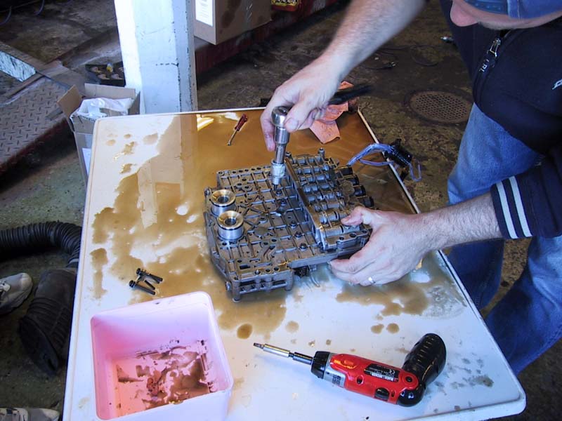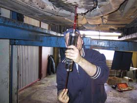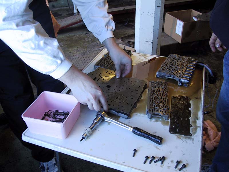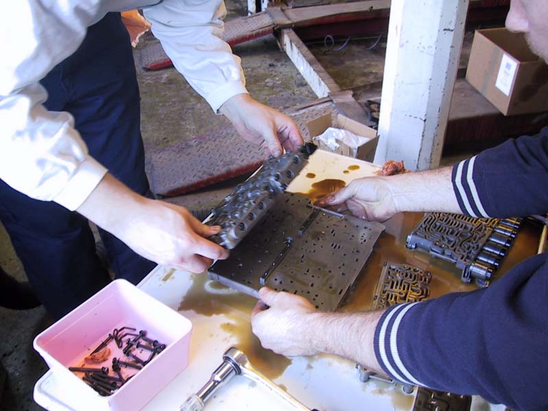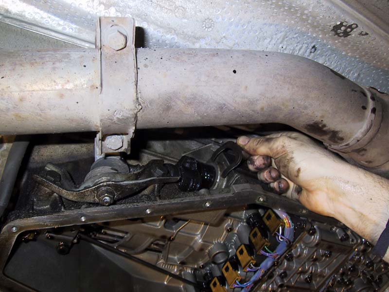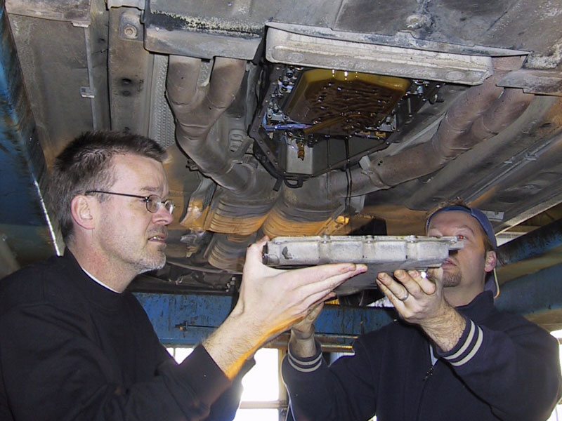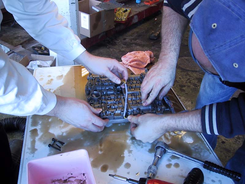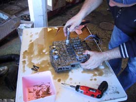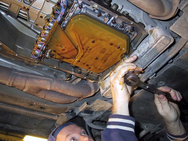 | Det sista som skall göras är att återfylla med olja. Principen är följande. Börja med att lossa påfyllningspluggen som sitter i tråget (17 mm insex), ungefär mitt under lådan. Fyll sedan på med olja tills olja rinner över kanten. Sätt tillbaka påfyllningspluggen, men dra inte åt den. Det är då dags att starta motorn. Låt motorn gå på tomgång och arbeta igenom växlarna en och en. Låt motorn dra lite på varje växel, ett par sekunder eller så. Ställ sedan växelväljaren i N. Låt nu motorn stå på tomgång och fyll i mer olja. Det går i minst lika mycket som fylldes i första gången. När olja rinner över kanten igen, är det dags att återmontera påfyllningspluggen och dra åt den. Det skall nu ha gått åt mellan 9 och 11 liter olja, lite beroende på hur mycket man spiller förstås. *