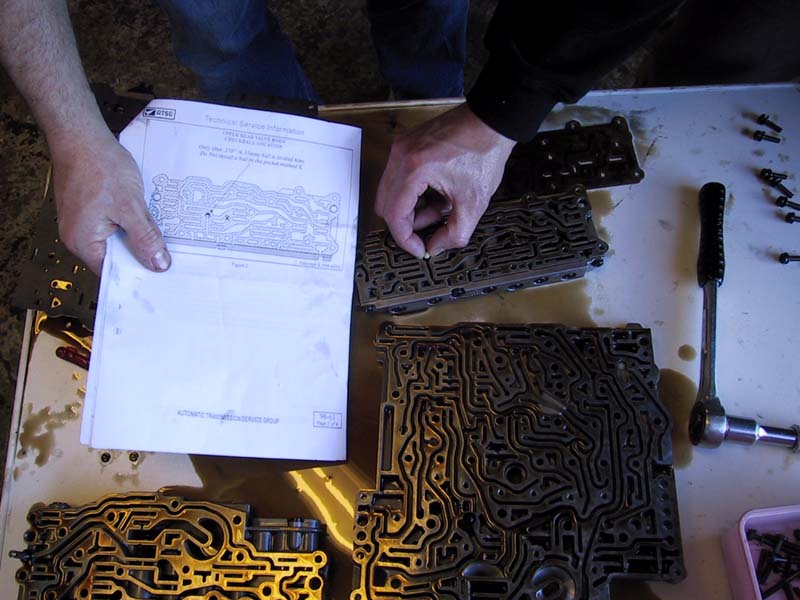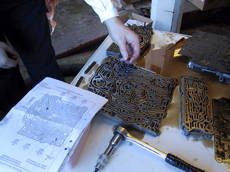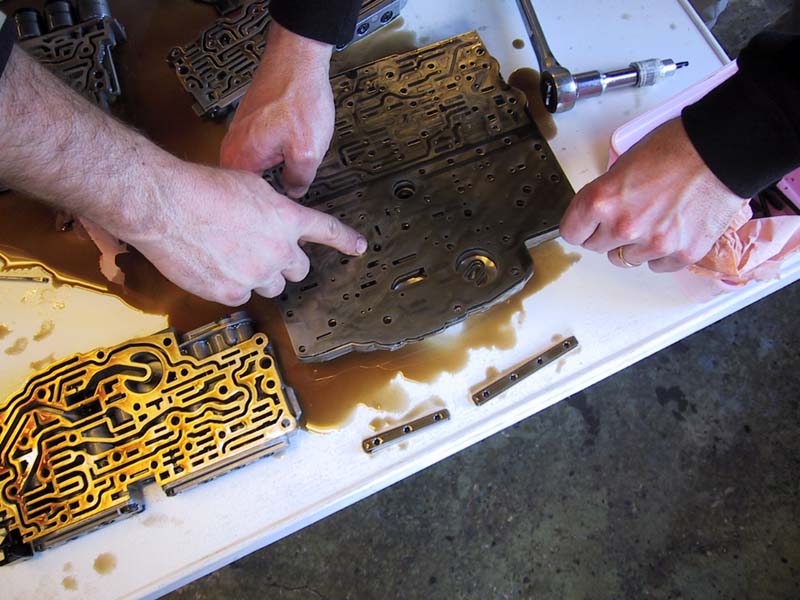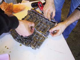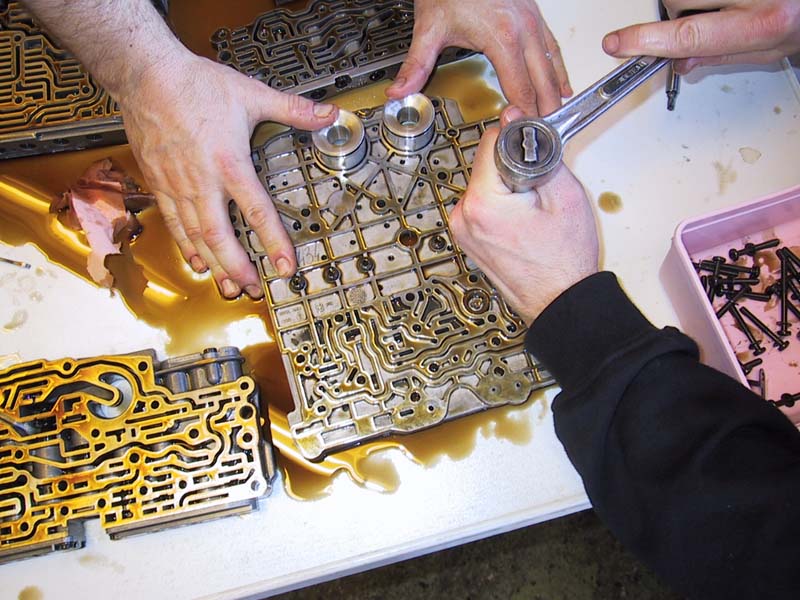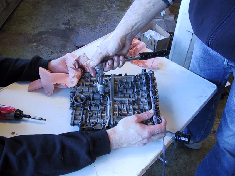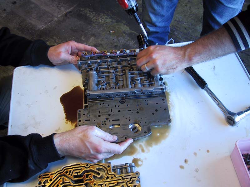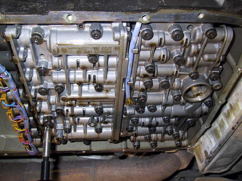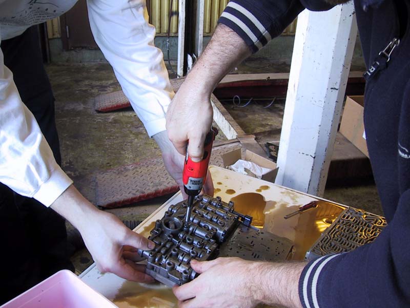 | Två saker är extra viktigt att tänka på vid återmontering av ventilhuset. För det första, se till att skjutventilen i plast hamnar rätt så att växelspaksreglaget sitter i spåret på skjutventilen. För det andra, lirka in kontakten i hålet i växellådan innan ventilhuset är monterat. I detta läge är det helt klart en fördel att disponera minst två par händer! Skruva i fästbultarna och dra åt dem.