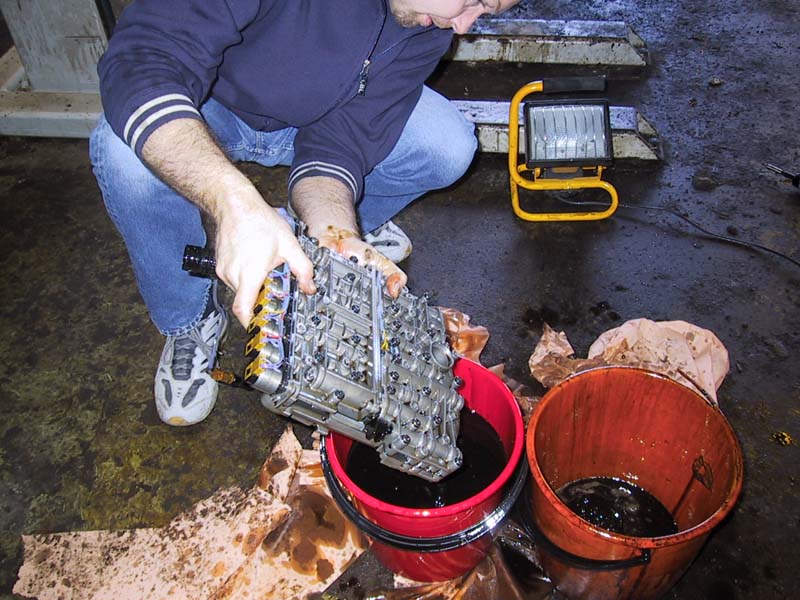 | Bilden visar växellådan med demonterat ventilhus. När ventilhuset demonterats kommer det att rinna ur mer olja. Totalt kan det rinna ur mellan 10 och 11 liter. Om du inte skall fylla på med ny olja är det viktigt att ta väl hand om den urtappade oljan. Använd en ren hink och täck över med lock när det slutat rinna kontinuerligt.