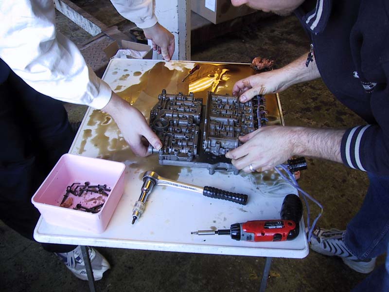 | Lossa nu resten av torxbultarna som sitter i ventilhusets bakdel. När dessa lossats kommer huset att dela sig i tre delar. Den stora delen i mitten, en del med alla kontakterna och en del som här på bilden ligger underst.