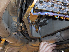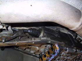 | Skruva ur bulten som håller givaren i bakkant av växellådan. Det är en 13 mm sexkantshylsa. Var noga med att lossa rätt bult, eftersom det sitter tre stycken ganska nära varandra. Endast den ena behöver lossas. När bulten lossas följer en metallbygel med som håller fast givaren. Tappa inte bort metallbygeln.