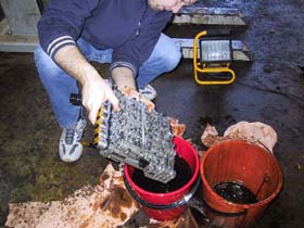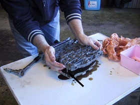 | Även ventilhuset innehåller en del olja. Försök att hälla ur så mycket som möjligt innan du påbörjar att öppna det.