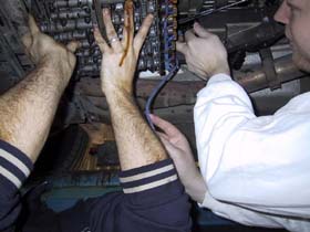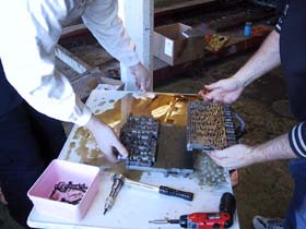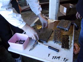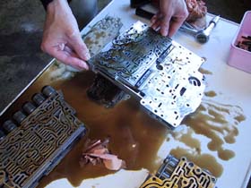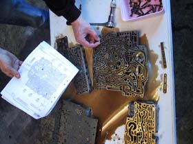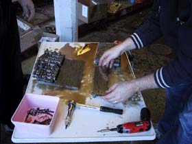 | Vänd försiktigt upp delen med kontakterna. Här är det vanligt att återfinna en av plastkulorna. Den skall dock inte ligga här, utan på andra sidan plåten, i stora delen. Var noga med att plocka bort den gamla kulan.