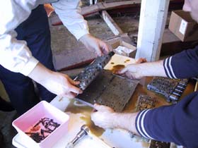 | Drag av den gamla packningen som sitter på plåten. Drag försiktigt, då är det lättare att få bort packningen i ett stycke. Den gamla packningen är oftast väldigt torr och spröd.