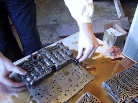 | Nästa steg är att återmontera resten av ventilhuset. Bakre nedre och övre delarna skall alltså monteras i stora delen. Börja med att lägga tillbaka plåten på övre delen och placera sedan stora delen av ventilhuset ovanpå i rätt läge. Det kan krävas lite tålamod för att hitta rätt. Här kan det vara till hjälp att använda ett par bultar för att hitta rätt.
