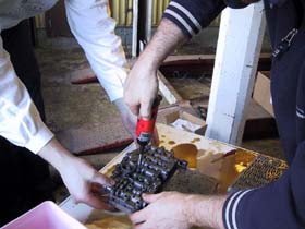 | Sänk försiktigt ned tråget. Tänk på att tråget innehåller ett par deciliter olja som inte runnit ur tidigare.