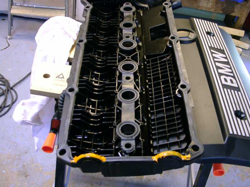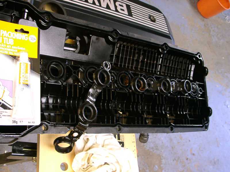 Bild 7. Här är kåpans undersida, med de gamla tändstifthålspackningerna, samt Hermetites packning på typ, som jag använt som dubbel säkerhet så länge det funnits på marknaden. Dvs mer än 20 år: