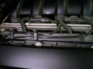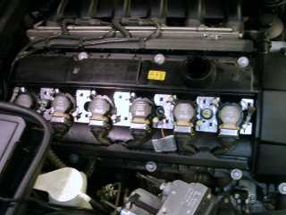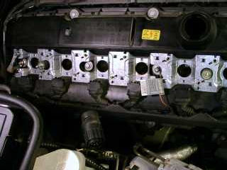 Bild 3. Här ser man hur det ser ut under kåporna ,de 6 tändspolarna med kablage, den lilla bruna är en jordkabel, tyska bilar verka använda brun jord , även Tyska Ford har den färgen: