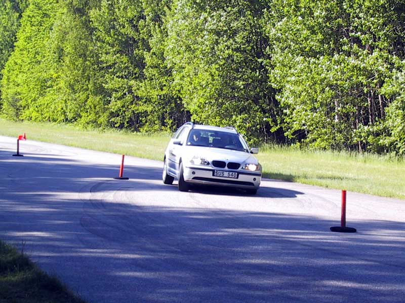 Avslutningen var slalomkörning genom en konbana. Den bestod av ett parti med långsamma snäva svängar, och ett parti med snabba vidsträckta svängar. Återigen visade de olika bilmodellerna på sina olikheter. En 318 Touring gick att köra med full gas genom hela det snabba partiet, medan en 325 ti var alldeles för snabb. Återigen låg åksjukan nära som passagerare, men som förare var övningen vansinnigt rolig. Det är sannerligen inte ofta man kör på gränsen för vad både förare och bil klarar av på allmän väg! Efter att ha kört ett tiotal varv per förare så var det dags för upplösningen; Tidtagning och tävling! Som åskådare var det lätt att se skillnader på hur respektive förare körde genom banan. En del försiktigt och nära konerna, en del med max attack och bredsladdar. Någon slutade till och med ute i gräset efter att ha laddat allt för mycket. Själv så var jag nöjd med min tid, men jag lyckades gå emot en kona på tillbakavägen. Med det tillägget som jag fick blev tiden inte tillräckligt bra för pall-placering.